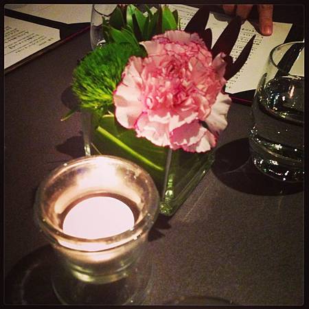 桌上放著典雅的花跟燭台