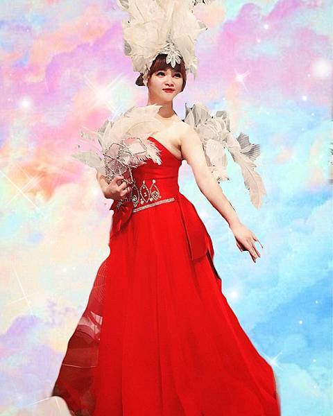 配合著紅禮服與頭飾給人的感覺,再加上白手套,完成了我的聯合婚禮禮服。