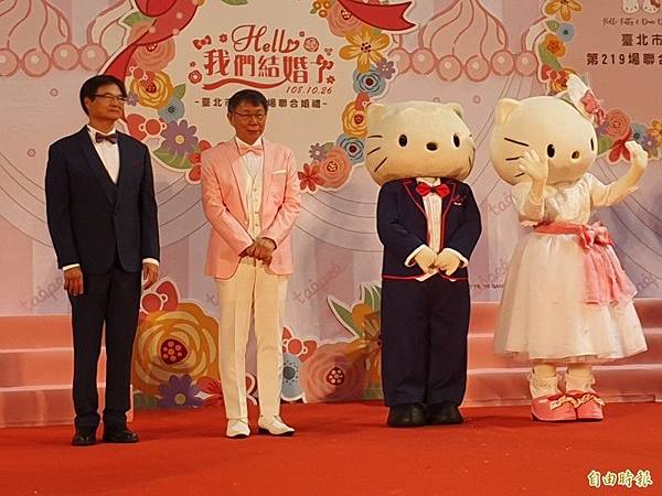 台北市大家長柯文哲先生身穿喜氣洋洋的粉紅襯衫,加上丹尼爾與凱蒂貓一起為新人慶賀。