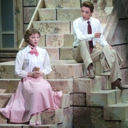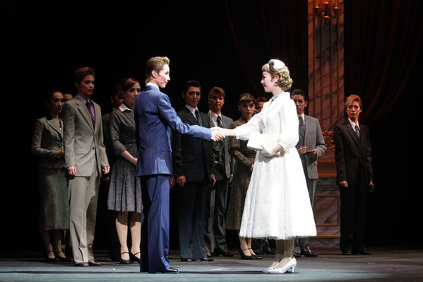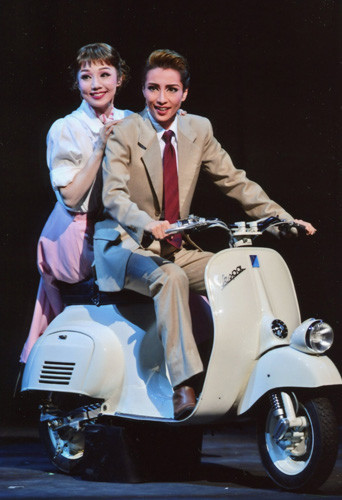 擔任男女主角的早霧與咲妃,是目前公認的寶塚黃金拍檔,長時間的好默契完全展現在作品上,兩位演員總是會「特別安排約會」,雖然身為觀眾的我早就知道故事裡男主角會愛上女主角,也知道這段露水鴛鴦之情無疾而終,但當女主角安公主第一次在大街上被男主角喬「撿到」時,我萌發一種「接下來這兩人會如何呢?」的期待,編導也抓緊觀眾的期待,安排一大段喬把安帶回家的戲,安公主神智不清地看著小套房天真問「這裡是電梯嗎?」「請幫我更衣」,還有喬將公主「滾」進沙發的互動,都可愛的不得了,最後一整段眾多媒體聚集皇宮的戲,視覺安排公主站在左舞台最高處,記者喬則是右舞台最低點,距離的落差,暗示兩人地位懸殊感,當喬進入皇宮第一句台詞「這裡是皇宮嗎?」開玩笑插科打混,卻覺得倍感心酸。