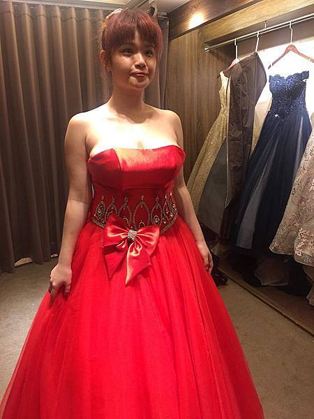 我就直接向法國巨星借了這件全紅又有大蝴蝶結的禮服。他們僅要求5000元押金,再歸還時退款。